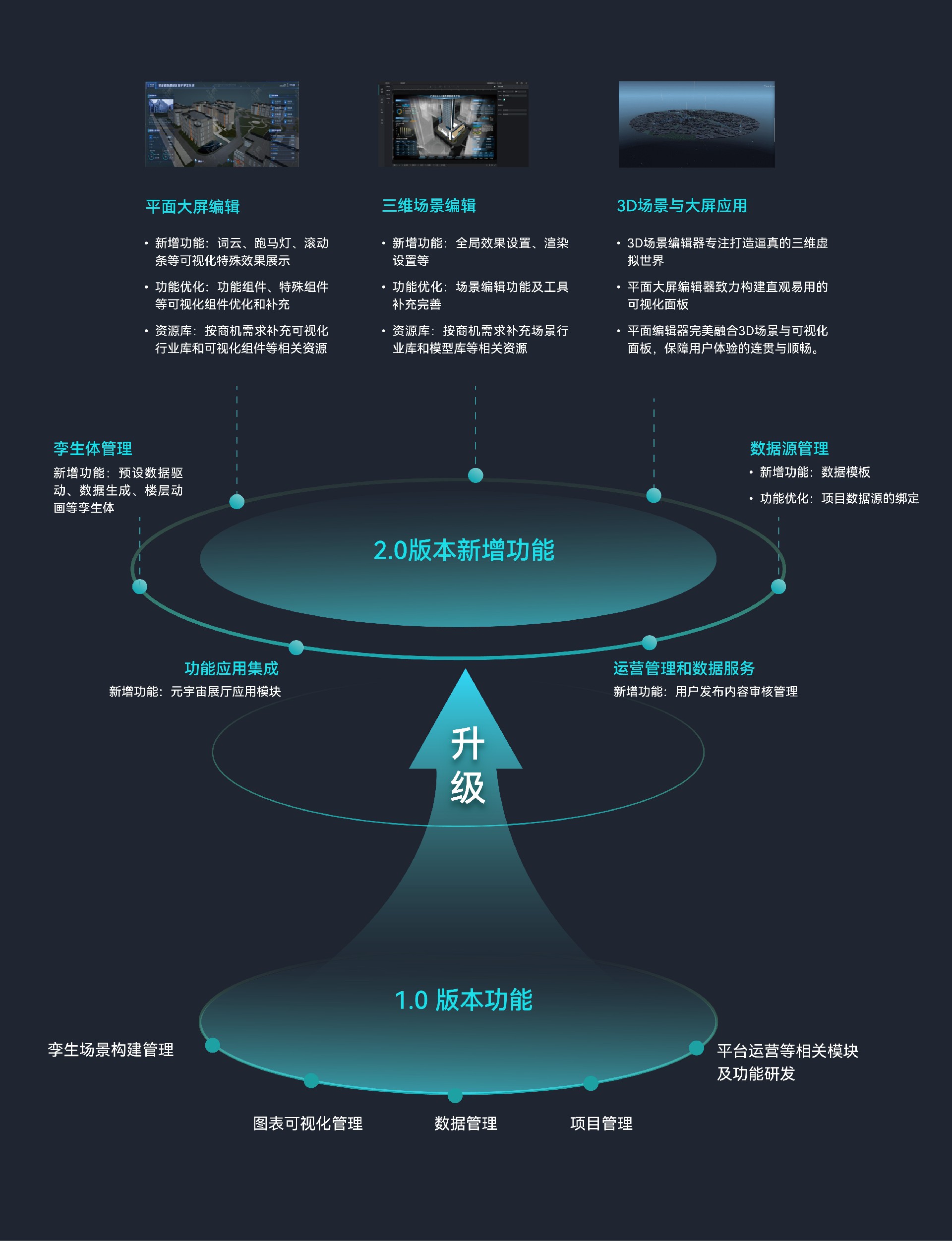 2023年,网思科技对该平台在孪生体管理、3D场景与大屏应用、数据源管理等七大模块进行了功能升级。